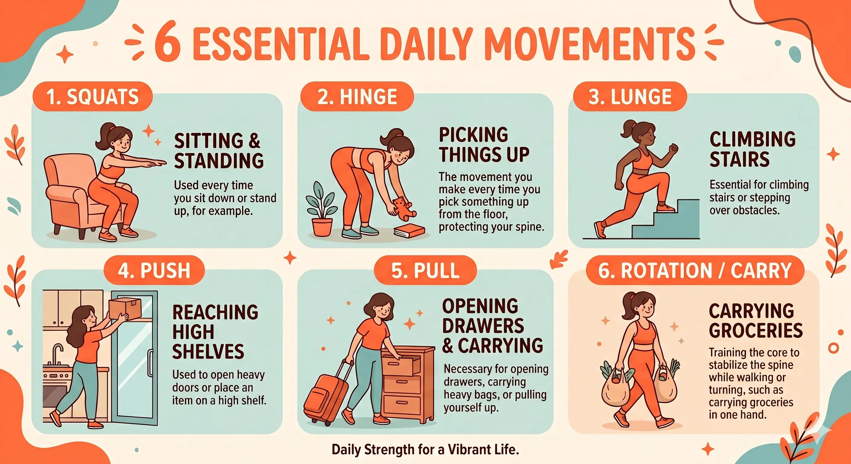 5. Pull: Necessary for opening drawers, carrying heavy bags, or pulling yourself up;